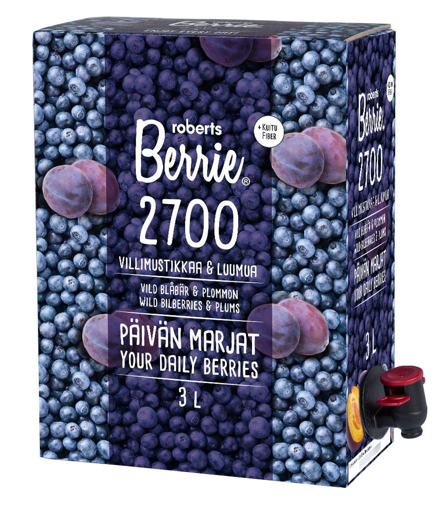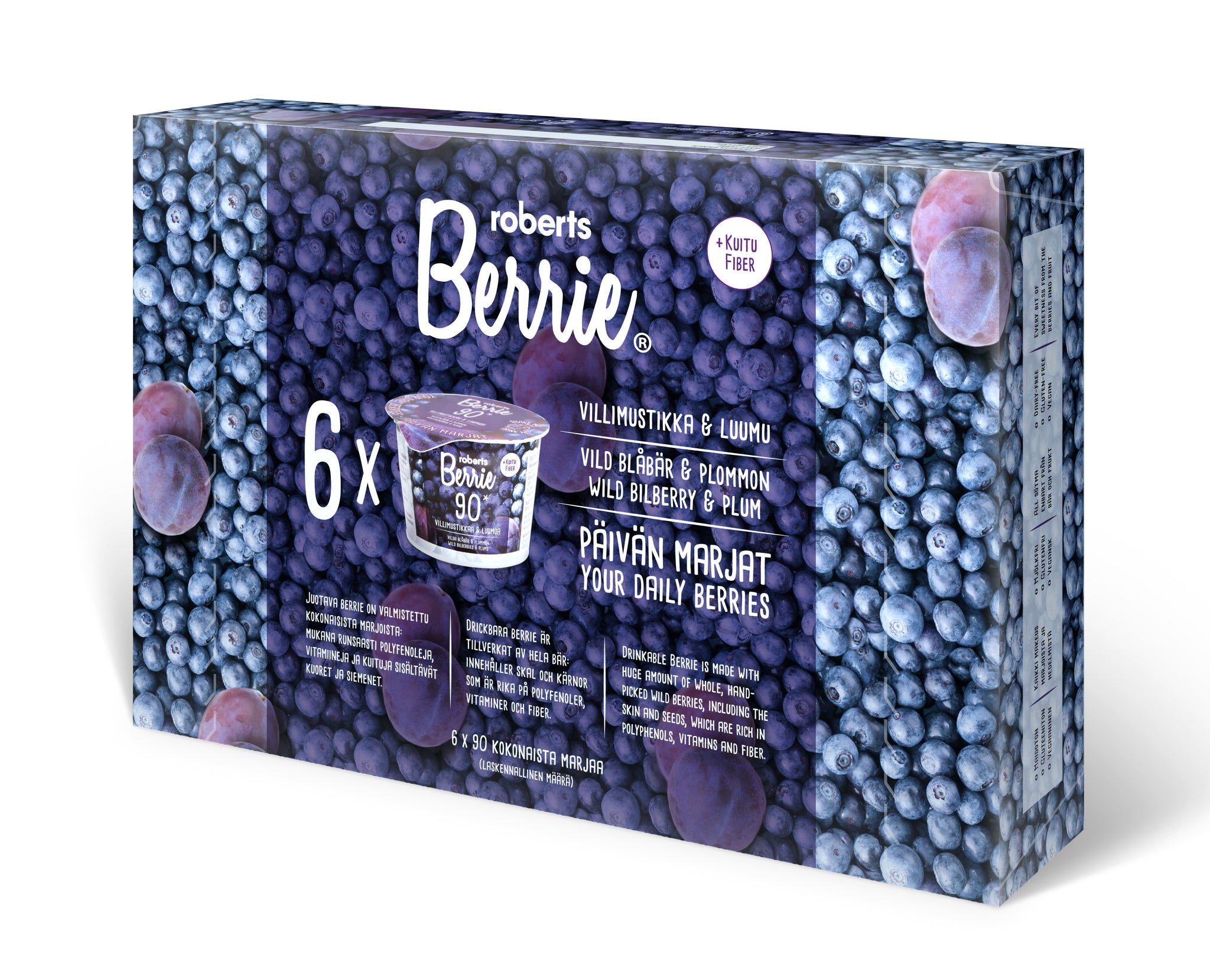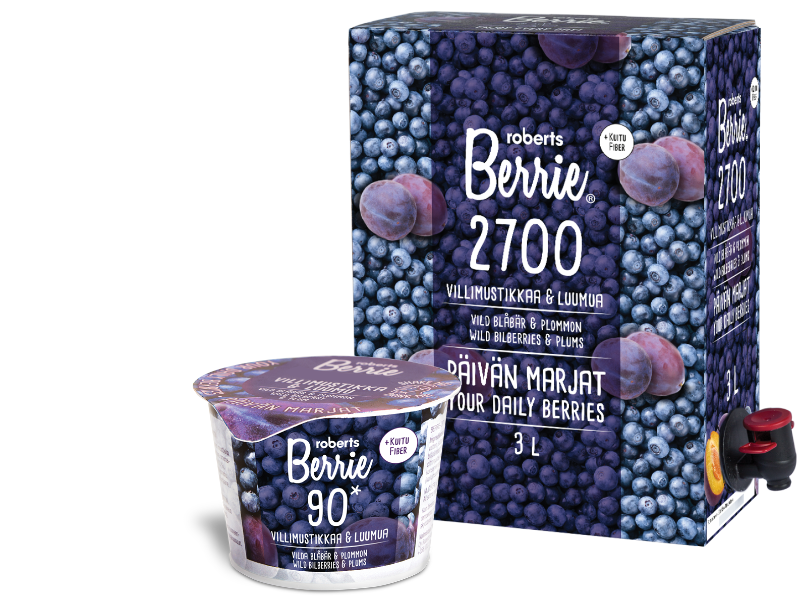 Egy pohár (100 ml) Berrie Vad fekete áfonya & szilva +rost 75 szem egész vad fekete áfonyából készül, szilvával és közel 7 g rosttal. (számítási mennyiség)